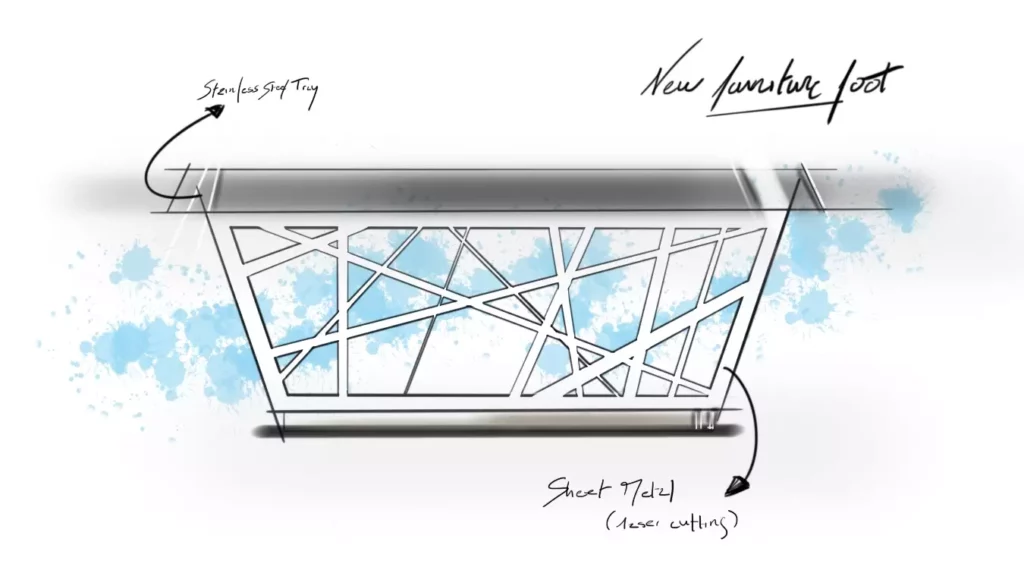 For this project, my design inspiration came from weaving, canvas textures, and 3D printing filaments. Using laser-cut sheet steel, I designed the furniture’s feet to ensure fluidity and ventilation. Additionally, I incorporated LED lighting to bring dynamism to the display.
